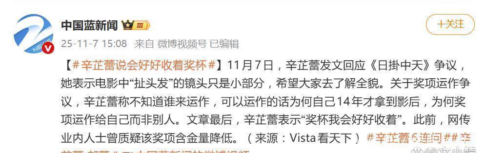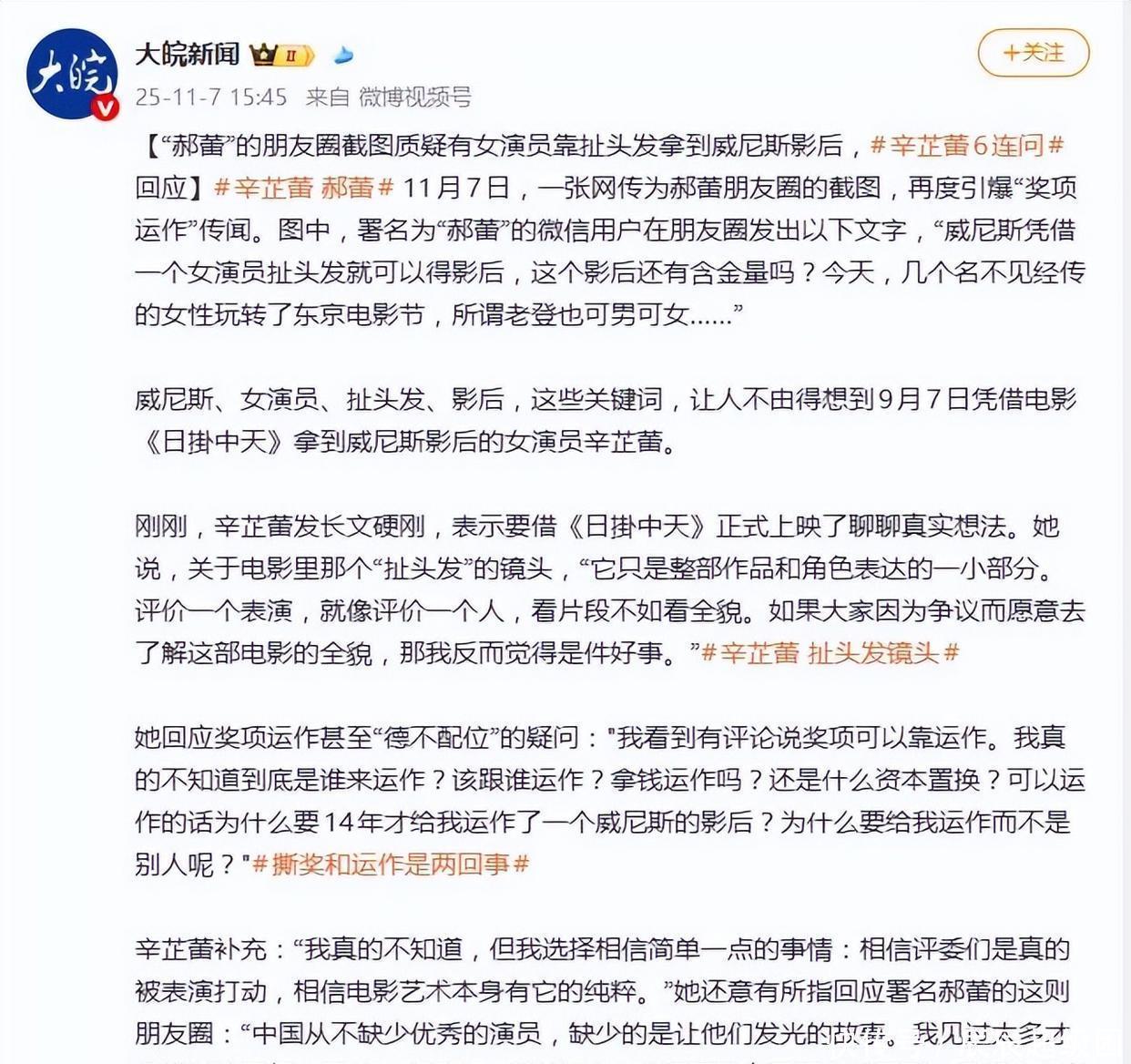 一座尼斯影后奖杯,竟炸出了满城风雨。11月7日,辛芷蕾用一串火药味十足的“六连问”正面硬刚质疑,把“《日掛中天》获奖威尼斯影后是否有黑幕”的争议推上了舆论浪尖。